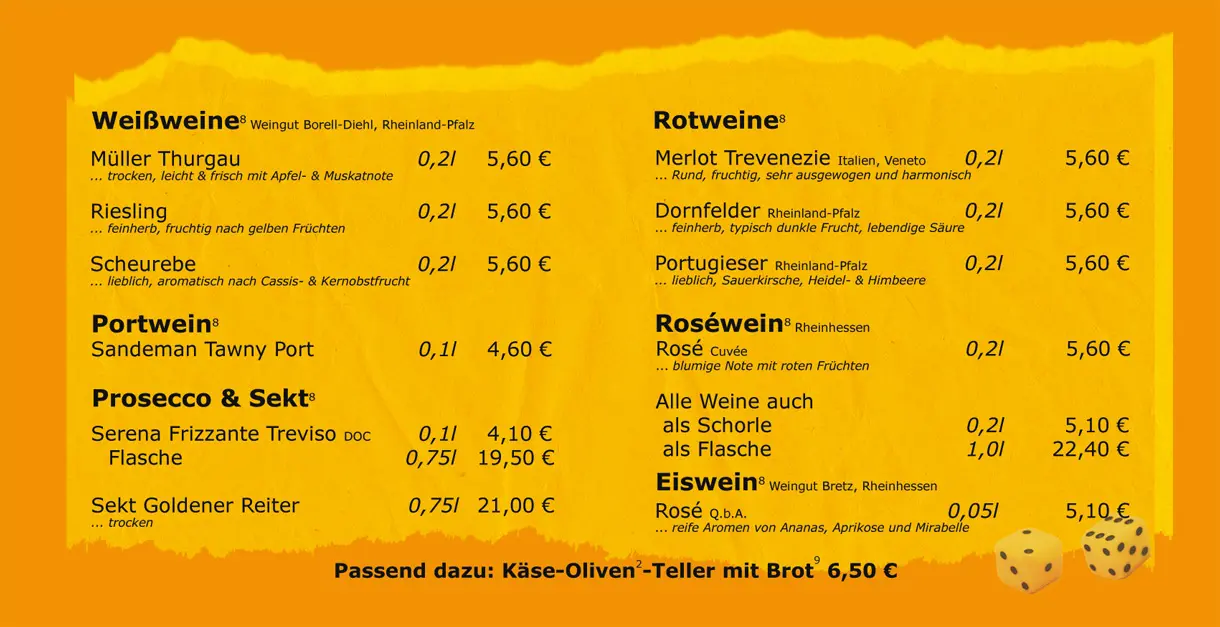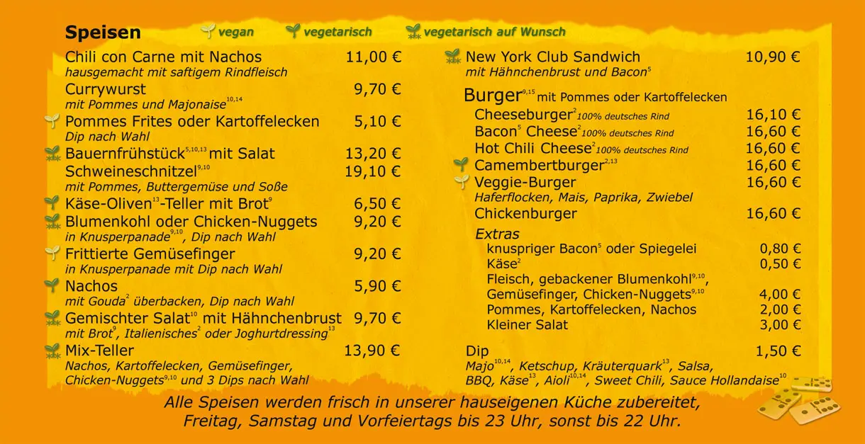 Alle Speisen werden frisch in unserer hauseigenen Küche zubereitet. Bei uns gibt es verschiedene Burger, Hausmannskost, Salat, Nuggets usw.