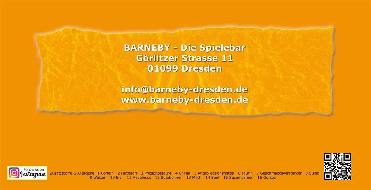 "Das Barneby öffnet täglich ab 18 Uhr. Dresden Neustadt. Im Barneby findet ihr im Innenbereich bis zu 90 Sitzplätze. Der Barneby Biergarten ist überdacht und hat ungefähr 90 Sitzplätze. Warme Küche mit Cheeseburger, Baconburger, Camembertburger mit Breiselbeeren, Veggie-Burger, Hot Chili Cheese Burger, Baconburger. Frische Speisen unter anderem Salat mit Italienischen- oder Joghurtdressing. Chili Concarne mit Brot, frisch aus der Pfanne. Schweineschnitzel mit Pommes und Ketschup oder Mayonnaise." "Selbstgemachte Chicken Nuggets mit verschiedenen Dips. Frischer Hackepeter mit Zwiebeln und Brot oder aber auch Nachos mit Käse überbacken. Als Snacks gibt es verschieden Schokoladensorten und selbst gemachte Brotchips. Zum Trinken gibt es bei uns kühles Bier vom Fass und auch Flaschenbier in verschiedenen Sorten. Als Heißgetränke servieren wir dir 9 verschieden Teesorten, Kaffee, Latte Macchiato und Espresso." "Für alle Autofahrer und welche, die keinen Alkohol trinken möchten, bieten wir jede Menge Saftsorten, Ginger Ale, Tonic, Bitter Lemon und Limonade an. Weißweine und Rotweine trocken, lieblich, halb trocken. Roßewein halb trocken mit einem Käse Oliven Teller. Das Barneby bietet dir Vanille-, Banane-, Himbeere- und Erdbeermilchshakes. Vodka Cola, Vodkaenergy, Vodkalemon, Gin-Tonic, Rum-Cola, Amarettoapfel oder Kirsch, Campari Orange, Aperol Spritz, Moscow Mule, Caipirinha, Bloody Mary, Flying Hirsch, Pick me up, Black Russian, Mexikaner, Giesela, Schwedenbecher, Mini-Gimlet, Rudi ist Jägermeister mit Bierschaum, Telfon Vodka mit Bitter Lemon, Staubsauger mit Vodka Batida und Grenadine. Long Island Icetea - Rum, Gin, Tequila, Triple Sec, Lime Juice, Orange, Cola. Wiki Waki Woo - Amaretto, Rum, Tequila, Vodka, Gin, Zitrone, Grenadine, Swimming Pool - Rum, Ananas, Kokos, Blue Curaçao, Pina Colada - Rum, Kokos, Sahne, Ananas. Tequila Sunrise - Tequila, Zitrone, Orange, Grenadine, Bahama Mama - Kahlúa, Rum, Malibu, Zitrone, Ananas, Schumann’s Aperol - Aperol2, Lime Juice, Zitrone, Orange, Cosmopolitan - Triple Sec, Limette, Cranberry."„Das Barneby bietet dir über 400 Spiele an. Funkenschlag, Privacy2, Siedler von Catan, Quiz, Würfeln, Kniffel, Yazzy, Dixit, Quarto, Showtime, Cleudo, Villa Paletti, Haste Bock, Scrabble, Tic Tac Boom, Bezzerwizzer, Wizzard, Rommé, 17 und 4, Skat, Brettspiele, Würfelspiele. Identik, Dame und Mühle, Iknow, Bam!, Qwirkle, Make a Brake, Pictures, Professor Pünschge, Panic Tower, Dream Team, Times up, DOG, Alles im Eimer, Trival Pursit, Herr der Ziegen, Quelf, Granium, Azul, Alibi. Spiel des Jahres. Kennerspiel des Jahres. Burst, Mystery, Dragomino, Salamanca, Meine Schafe deine Schafe, Bingo, Risiko, Monopoly, Verflixxt, Werwölfe die Gemeinde, Pit, Concept, Frauen und Männer, Norderwind, Potion Explosion, Fauna, Gangster City, Take it Easy, Karak, Adel Verpflichtet, Thurn and Taxis, Dragomino, Broom Service, Alcatraz, Roar a Saurus, Micro Macro, Hexentanz, Mutabo, Just 4 Funf, Dominion, Yukon Airways, Das letzte Banket, Wahrheit oder Lüge, Kuhhandel, Skyjo, We will Wok you, Anasazi, Burst, Phase 10, Galapagos, Wer wird Millionär, Ein solches Ding, On Top, Munchkin, Dungeon Fighter, The Island, Lift it, Schach, Fiasko, Dream Team, Mieses Karma, Tal der Wikinger, Rummy, Bubble Bomb, Machi Karo, Adios Amigos, Sauschwer, Kerflip, das perfekte Alibi, Codenames, Haste Worte, 6 nimmt, Nobody is perfect, Qwirkle, Spiele Magazin, Götter Dämmerung, Nur die Ziege zählt,Exacto, Bohnanza, Kakerlaken Salat, Tatort Tonne, Porca Miseria, Vampir, Snowhere, R-Öko, Life Style, Orange Stories, Zatre, Kreuzwort legen, Topas, Byzanz, Bücherwurm Moomery,Ano Domini, Die Legende von Andor, Das perfekte Alibi, Ohne Furcht und Adel, Asterix und Obelix, Krazy Words, Chez Guevara, Scotlandyard, Game of Quotes, Friedemann Friese Freitag, Es war einmal, Sitting Ducks, Soboteur, Color Addict, Splitter Die drei ???, Mückenstich, Hoppladi Hopplada, Machi Koro, Roja, Go, Sagaland, Quiz, Mankomania, Das Mad Spiel, Graffiti, Fits, Der eiserne Thron, Privacy Numbers Der kleine Hobbit, Glupsch Geister, Cro-Magnon, Pictionary, Bamboleo, Ein Nilpferd kommt selten allein, Gulli Piraten, Tabago, Kingdom Builder, Niagara, Zooloretto, Camel Cup, Keltis, Bausack, Wer wars und vieles mehr.“ „Zum Barneby gehören 2 Ferienwohnungen in Dresden. Die Wohnungen befinden sich im Stadtteil-Neustadt, es ist Europas größtes zusammenhängendes Gründerzeitviertel. Mit seinen wunderschönen Häuserfassaden bietet es ein aufregendes und spannendes Tag- und Nachtleben. Kneipen, Bars und Restaurants findest Du ebenso hier, wie kleine Läden, Galerien und Künstlerwerkstätten, dies ist alles bequem zu Fuß zu erlaufen. Die Altstadt mit Ihren Sehenswürdigkeiten wie Schloß, Semperoper oder Frauenkirche kann man gemütlich zu Fuß erreichen. Wohnzimmer: Essecke mit großem Esstisch bis 4 Personen, Kabel-TV, ausziehbare Couch bis zu 2 Personen, kostenloses Wlan Bad: WC, Wanne, Haartrockner, Kosmetikspiegel, Waschmaschine, große und kleine Handtücher Schlafzimmer: Doppelbett inkl. bezogener Bettwäsche, Kabel-TV, großer Kleiderschrank, zwei Nachtschränke Küche: Spülmaschine, Kühlschrank, Kaffeemaschine, Toaster, Wasserkocher, Cerankochfeld, Backofen, Geschirr Diese gut geschnittene 2 Zimmer-Nichtraucher-Wohnung ist für 4 Personen und mit viel Liebe zum Detail eingerichtet, so wie wir auch uns selbst eine Ferienwohnung wünschen.“